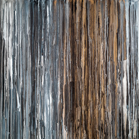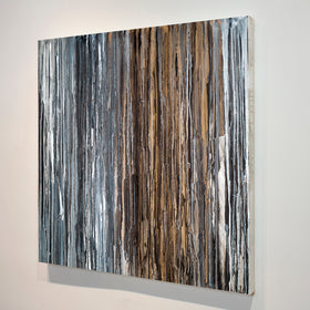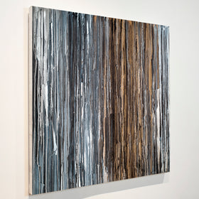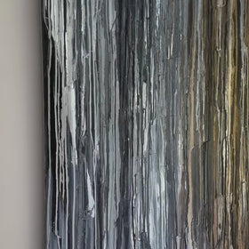 This painting is from my drip collection. I first paint a few layers with color and texture. Then I drip fluid paint with strong pigment to move down the canvas over the textured surface merging into the other paint creating new colors. I love the patterns and saturation of blue greys, white, black, creams and gold. I always want to touch the surface!
