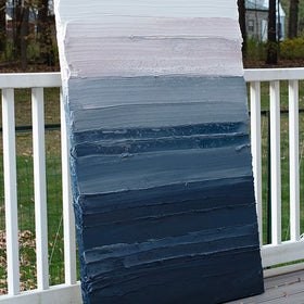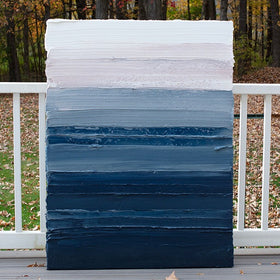 This painting is unique with a thick, textured layer that extends off and around the sides, resembling a wall sculpture. The canvas is gallery wrapped and wired for easy hanging, eliminating the need for framing.
